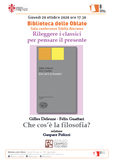 Qui trovate la registrazione della lezione tenutasi il 29 ottobre 2020 alle 17.30 su Gilles Deleuze e Felix Guattari “Cos’è la filosofia?”, primo appuntamento autunnale del ciclo “Rileggere i classici per pensare il presente”.