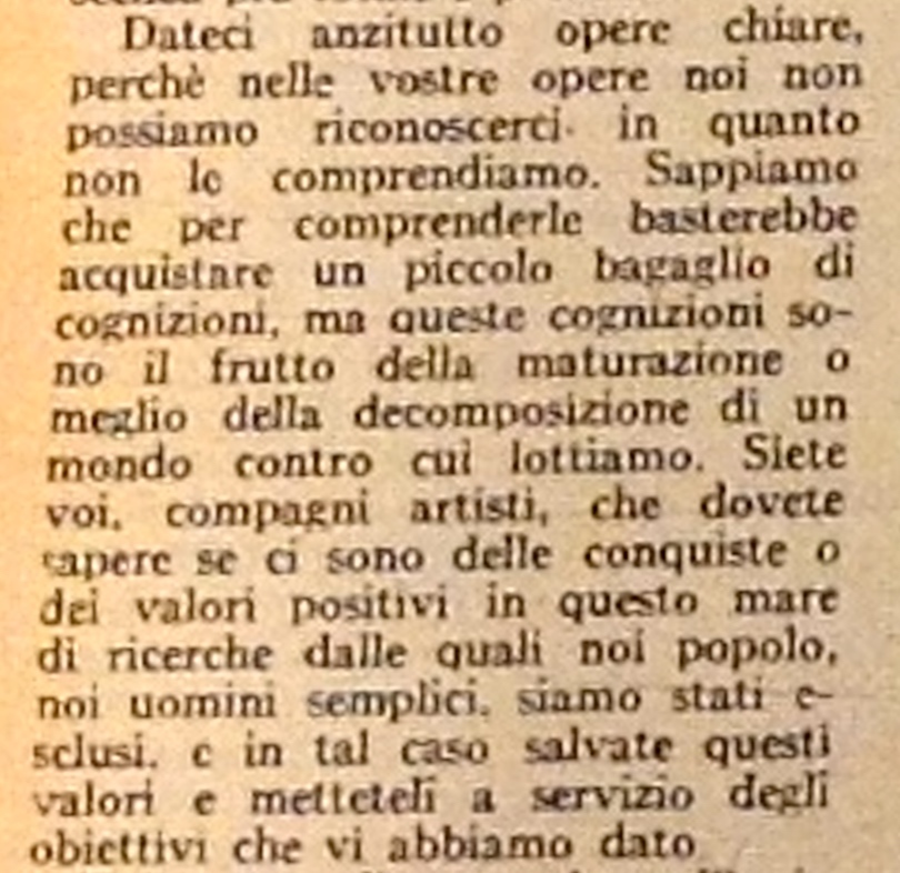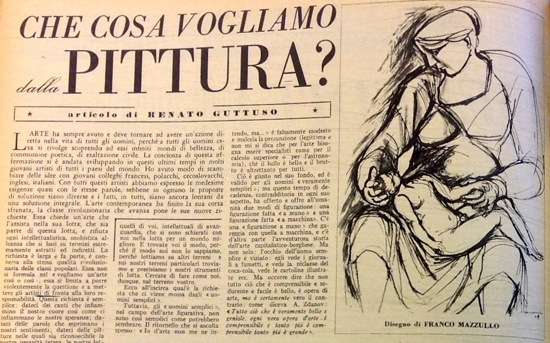 In pratica, significava fidelizzare i simpatizzanti, coinvolgere la cittadinanza nelle iniziative del partito, capillarizzare i canali di comunicazione politica; secondo l’adagio, costruire “una sezione per ogni campanile”. Tale operazione doveva essere portata avanti attraverso tutta una serie di elementi: il complesso sistema delle scuole di partito; la stampa e l’editoria, le cui testate venivano continuamente ristrutturate e aumentate; il lavoro nelle sezioni e nelle federazioni e l’organizzazione del tempo libero grazie alle case del popolo, alle feste de l’Unità, e alle tante altre iniziative sociali; ovviamente la Fondazione Gramsci di Roma e, più tardi, la rete degli Istituti Gramsci. Anche la politica culturale fu concepita retoricamente sul “popolo”: l’arte, spiegava Togliatti, non poteva essere arte se non era espressione del “popolo” e “al servizio del popolo” (un esempio di tale narrativa in Renato Guttuso, Che cosa vogliamo dalla pittura?, in «Vie nuove», 30, 24 luglio 1949 [FIGG. 12 e 13])