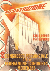 Il “popolo” rimase l’architrave della narrazione comunista anche negli anni successivi e per tutto il ventennio compreso tra la fine degli anni ’40 e la fine degli anni ’60, base stessa nella concezione comunista della ricostruzione dell’Italia, come mostra bene il notevole manifesto della federazione comunista di Modena: «con il popolo, per il popolo» [FIG. 9].