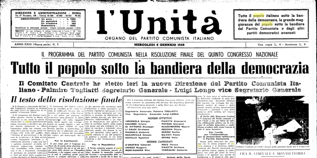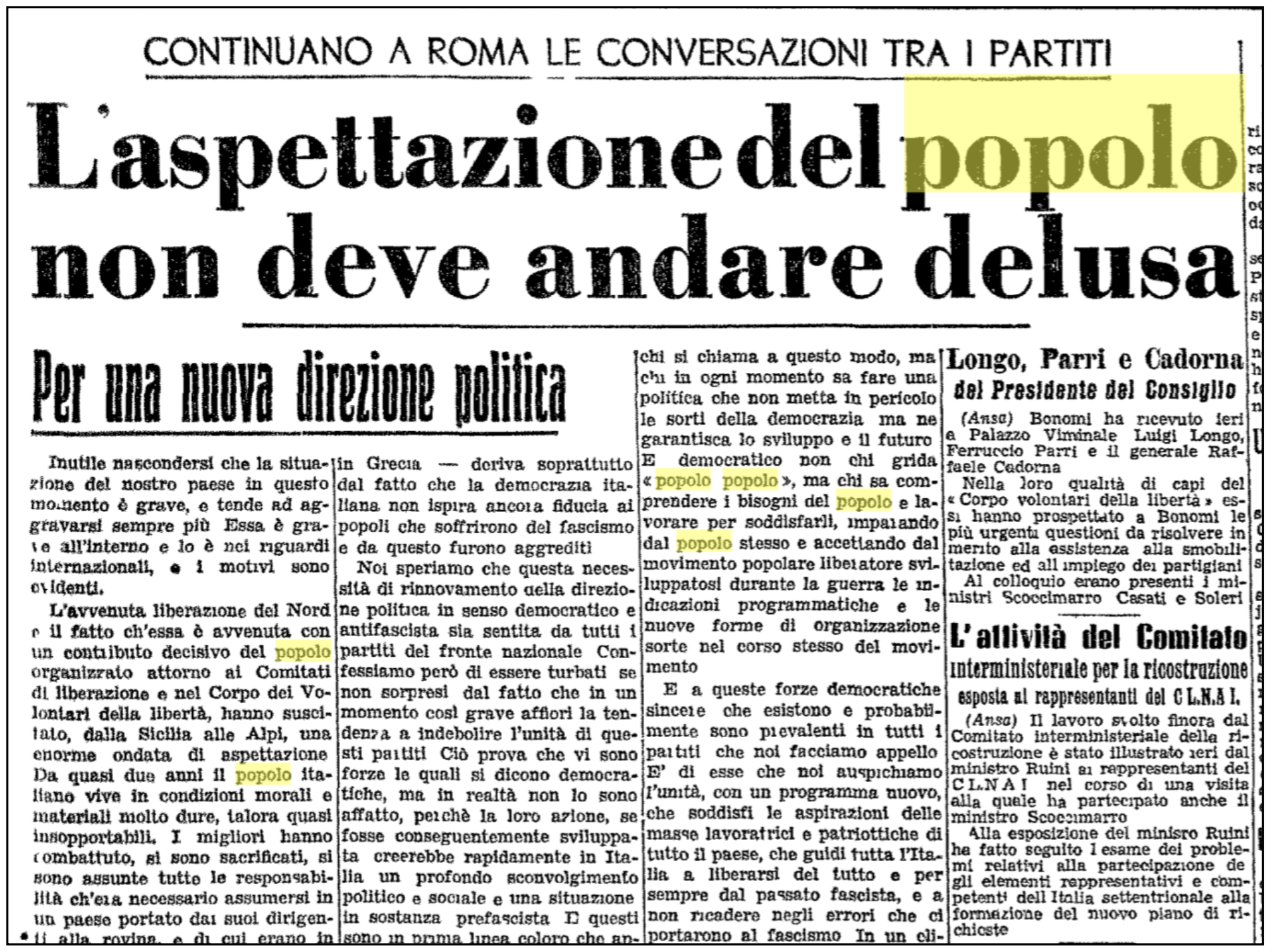 Da un punto di vista della semantica storica, questo cambiamento può essere apprezzato da diversi punti di vista e in particolare nella reiterazione di alcune associazioni semantiche. In primis “tutto il popolo” e il “popolo italiano”, che devono essere interpretati come elementi fondamentali di una costruzione retorica che univa narrativamente elementi populisti e nazional–patriottici (si veda per esempio l’articolo Tutto il popolo sotto la bandiera della democrazia, in «l’Unità», 7, 9 gennaio 1946 [FIG. 5]).