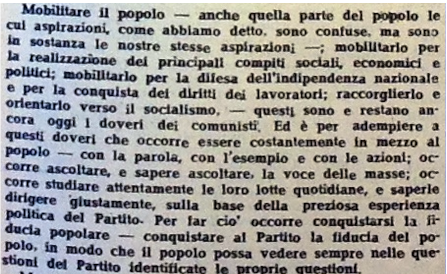 D’altra parte, e non è un dato da poco, proprio la coerenza e l’ampiezza con le quali fu portata avanti la popolarizzazione sono in grado di spiegarci la posizione di indiscussa egemonia sulla sinistra mantenuta dal PCI per oltre trent’anni.