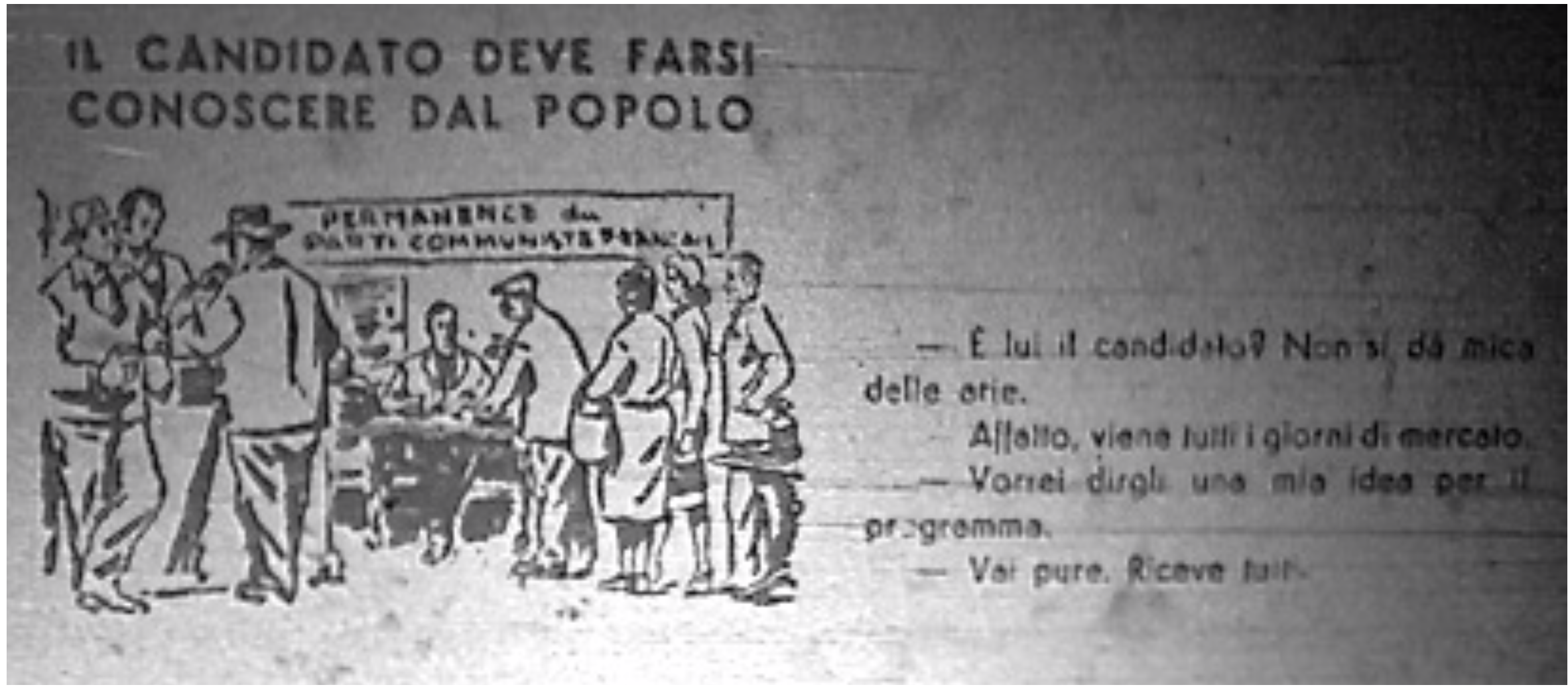 Il popolo era infatti la chiave di volta della stessa auto–rappresentazione del partito e della stessa dirigenza. In primo luogo, infatti, il PCI si presentava ormai principalmente come “partito del popolo”, a volte anche con le iniziali di “partito” e “popolo” in maiuscolo; nelle parole di Teresa Noce sul quotidiano: «Il V Congresso Nazionale del Partito Comunista non è stato solo una prova di grande maturità politica e di forza nazionale organizzata. Esso è stato anche la dimostrazione concreta che il Partito Comunista è, e si avvia a diventare sempre più, un vero Partito del Popolo, il Partito della solidarietà nazionale» (Estella, Il partito del popolo e della solidarietà nazionale, in «l’Unità», 9, 11 gennaio 1946). Allo stesso modo e in secondo luogo, il “dirigente di tipo nuovo” e il “candidato” del partito di massa togliattiano dovevano presentarsi come “l’uomo popolare”, vicino al popolo (Il candidato deve farsi conoscere dal popolo, in «Quaderno dell’attivista», settembre 1948 [FIG. 10]).