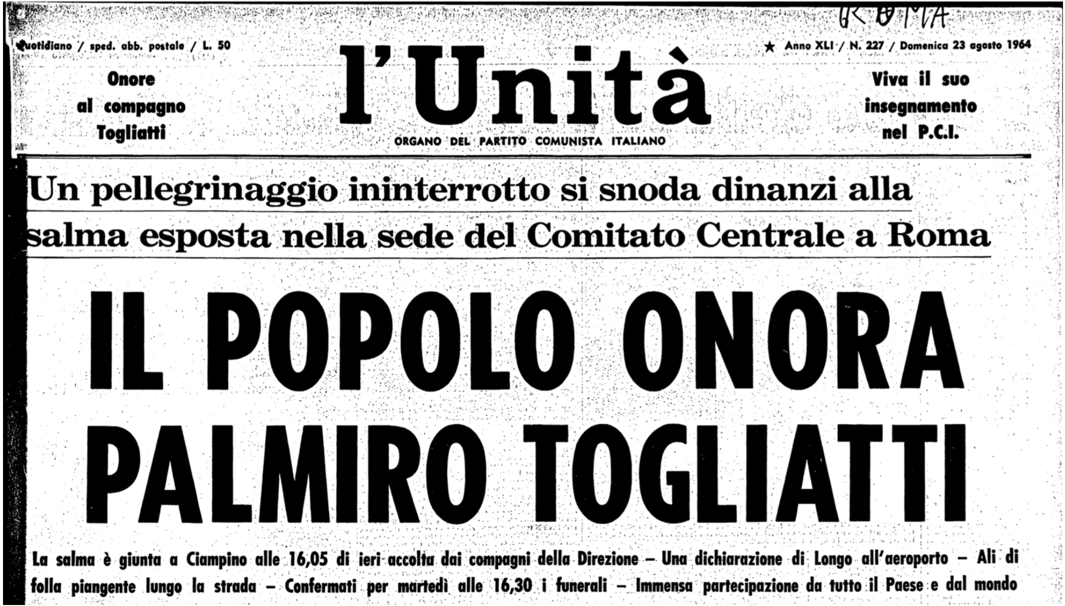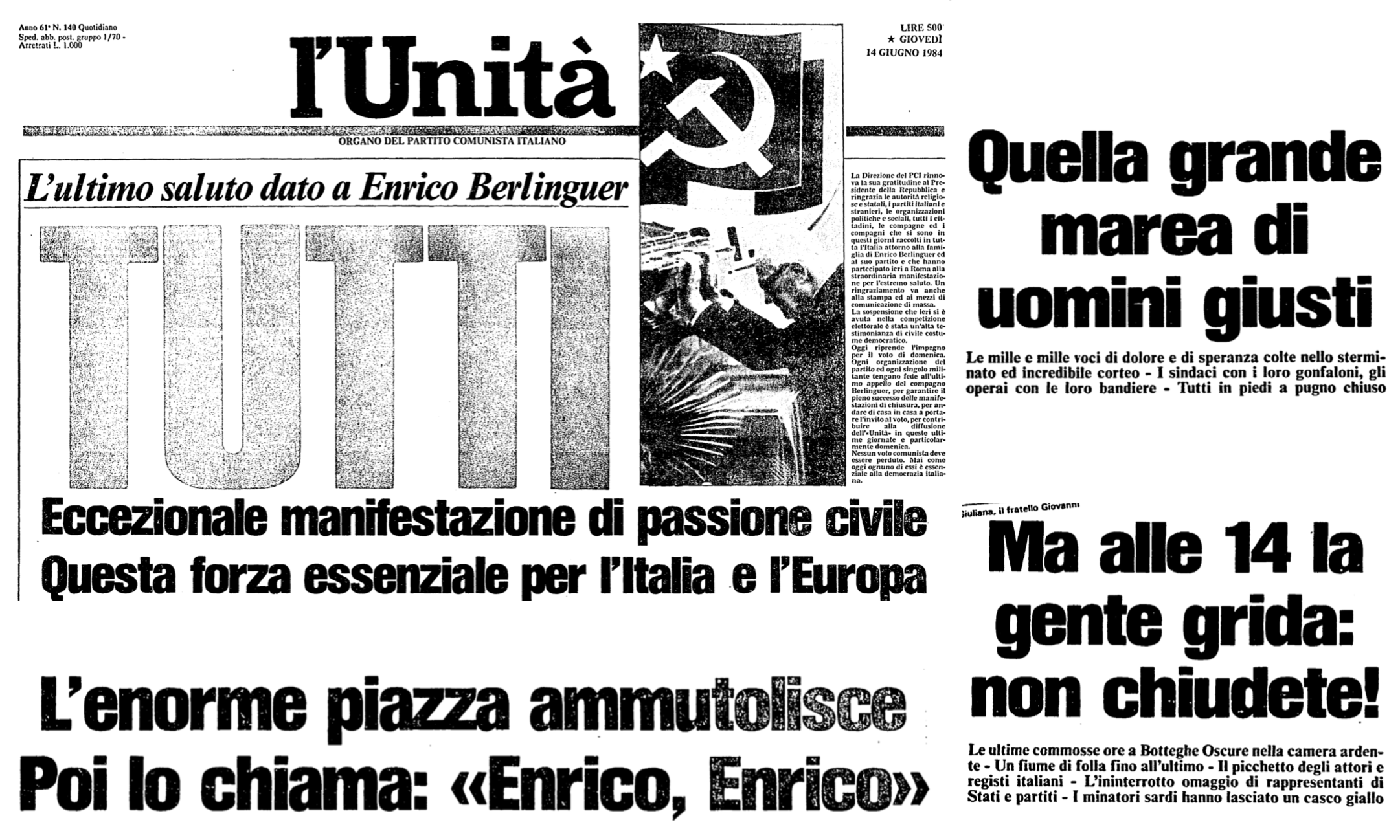 Soprattutto durante gli anni ’70, però, gli anni del movimento studentesco, delle lotte operaie, della sinistra extra–parlamentare e del femminismo, il discorso sul popolo finì per avvitarsi velocemente su sé stesso. D’altra parte, il completo abbandono di questa retorica, negli anni ’80, e l’indirizzo politico verso una fetta sempre più minoritaria della popolazione — quella che sarebbe stata chiamata la “società civile” — ha giocato in chiave contraria, aumentando vertiginosamente le distanze tra partito ed elettorato. Fornisce un chiaro esempio di questo completo abbandono del popolo ancora una volta la stampa di partito, per l’occasione dei funerali di Berlinguer. Su «l’Unità» del 14 giugno 1984 gli appellativi variavano da «tutti», «gente», «enorme piazza», «immensa folla», «mille voci di dolore e di speranza», «sterminato corteo», «marea di uomini giusti», «tutta la città»; pochissimi, invece, i riferimenti al popolo. Il percorso è particolarmente lampante se si confrontano gli articoli che, venti anni prima, avevano celebrato la morte di Togliatti, quando il popolo era stato protagonista indiscusso della commemorazione e del racconto su di essa (Il popolo onora Palmiro Togliatti, «l’Unità», 227, 23 agosto 1964; L’ultimo saluto dato a Enrico Berlinguer, «l’Unità», 140, 14 giugno 1984 [FIGG. 15 e 16]).