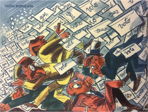Esempi importanti di questa rinnovata retorica comunista possono essere rintracciati principalmente negli appelli comunisti durante l’ultimo anno di guerra e soprattutto nelle prime campagne elettorali, come mostrano bene le elezioni del 1946, del 1948, e del 1953 (un esempio, per il 1953, nella vignetta di Majorana, Voto popolare, in «Vie nuove», 25, 21 giugno 1953 [FIG. 6]).
