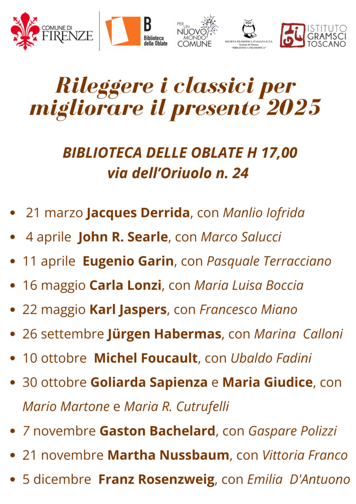 Calendario “Rileggere i classici per migliorare il presente 2025”, Biblioteca delle Oblate ore 17