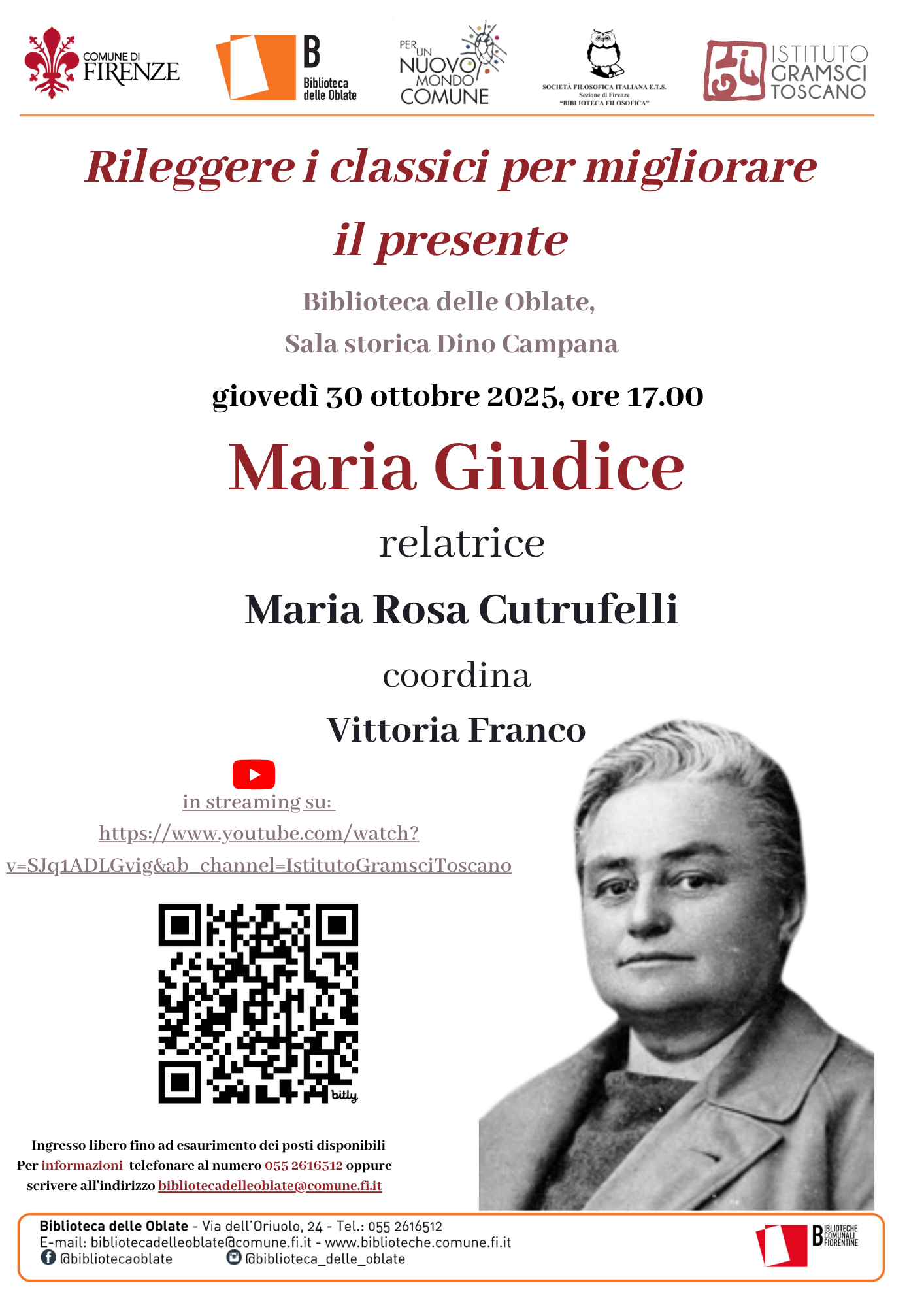 Conferenze, convegni e seminari Rileggere i classici per migliorare il presente: Maria Giudice, giovedì 30 ottobre, ore 17, Biblioteca delle Oblate Leggi tutto » Ottobre 16, 2025